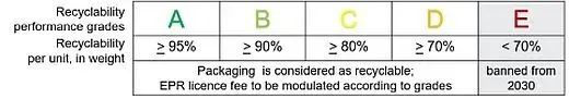 欧委会所建议的五级回收评价依据的是可回收的包装质量比例:70%以下的质量是不可回收的包装将在2030年开始被禁止。从2035年开始,只有可以规模化回收的包装才被允许进入市场。