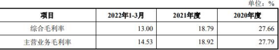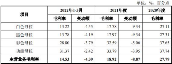 草案显示,报告期内,标的公司主要营业业务产品毛利率分别是27.79%、18.92%和14.53%,2021年毛利率下降8.87个百分点,2022年1-3月下降4.39个百分点,呈下降趋势,主要受上游原材料自2021年来持续涨价、市场之间的竞争加剧等因素影响。2021年,受到原油等大宗商品涨价影响,标的公司主要原材料切片、钛白粉的采购价格持续上涨,2021年钛白粉平均单价17.18元/kg,同比上涨20.66%;切片平均单价6.18元/kg,同比上涨23.34%;炭黑平均价格14.02元/kg,同比上涨4.64%。标的公司面临材料价格持续上涨时,会与客户协商调整母粒销售价格,而销售价格持续上涨难以及时、充分消化原材料涨价的影响,售价上着的幅度不及成本上着的幅度,使得毛利率会降低。2022年1-3月,切片、钛白粉、炭黑等主要原材料价格持续上涨,平均采购单价分别较2021年上涨7.55%、11.77%及8.78%;此外,受春节假期影响,标的公司产能未充分释放。2022 年 1-3 月产能利用率仅 65.70%,规模效应未充足表现;以上因素综合影响了2022年一季度毛利率水平。