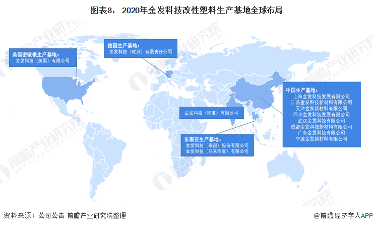 目前金发科技在全世界内,共有13个生产基地。其中,中国共有8个生产基地,分别位于上海、江苏、天津、四川、湖北、成都、广东和浙江。其余的生产基地遍布于全球各地,包括美国密歇根、德国、泰国、马来西亚和印度。