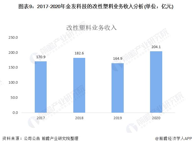 从改性塑料业务的经营情况去看,2017-2020年,金发科技的改性塑料业务呈波动上升态势,2020年金发科技改性塑料业务营业收入营业收入为204.1亿元,同比增长了23.77%。