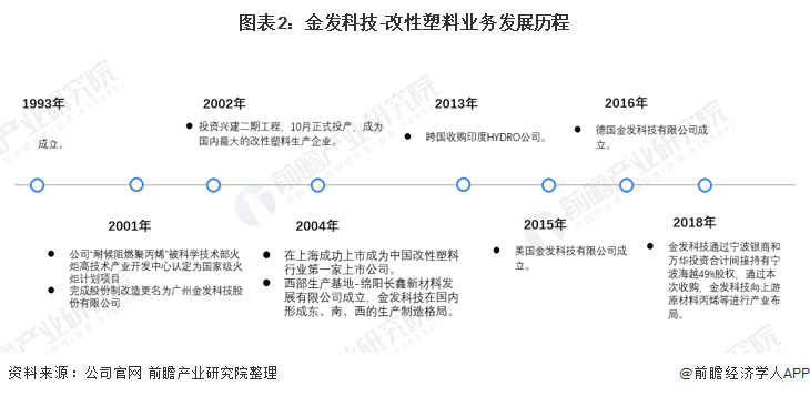 1993年,金发科技成立;2001年,公司“耐候阻燃聚丙烯”被科学技术部火炬高技术产业开发中心认定为国家级火炬计划项目,同年完成股份制改造更名为广州金发科技股份有限公司;2002年,投资兴建二期工程,10月正式投产,成为国内最大的改性塑料生产企业。2004年,在上海成功上市成为中国改性塑料行业第一家上市公司;西部生产基地-绵阳长鑫新材料发展有限公司成立,金发科技在国内形成东、南、西的生产制造格局。